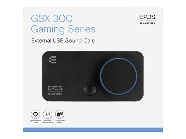 La GSX 300 constitue une excellente solution pour les joueurs en quête de performances audio améliorées, qui ne souhaitent pas utiliser la carte son de leur PC. Associée à un casque gaming, la carte GSX 300 combinée à la Gaming Suite EPOS offre un excellent traitement numérique du son ainsi qu'un son surround 7.1 EPOS personnalisable. L'anneau LED autour du bouton de réglage du volume s'allume en bleu avec le son 2.0, en rouge en mode 7.1.