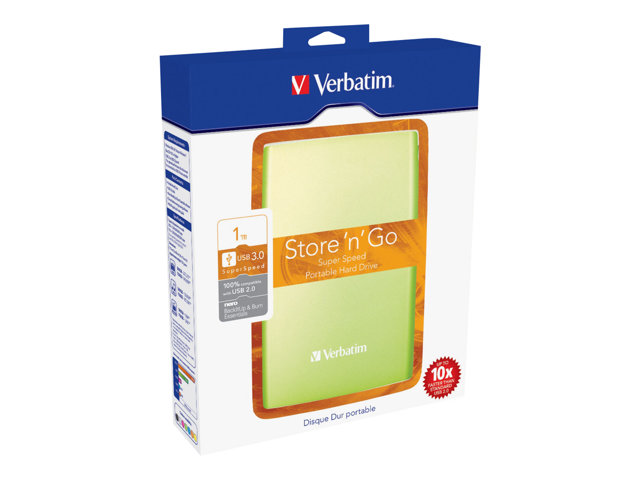 Le disque dur portable Verbatim Store 'n' Go est une solution de stockage hautes performances qui utilise une interface USB 3.0 haute vitesse. La norme USB 3.0 permet d'atteindre des débits multipliés par 10 par rapport à l'USB 2.0 (sur la base de mesure de la vitesse de bus USB), vous offrant un taux de transfert de données ultra-rapide.