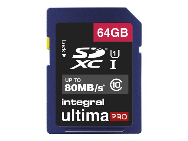 Description du produit Integral UltimaPro - carte mémoire flash - 64 Go - SDXC UHS-I Type du Produit Carte mémoire flash Format Carte mémoire SDXC UHS-I Capacité de stockage 64 Go Indice de vitesse UHS Class 1 / Class10 Garantie du fabricant Garantie de 5 ans -