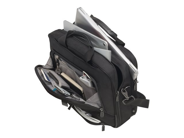 Avec l'Eco Top Traveller PRO, vous êtes un voyageur de " première classe ". La sacoche toploader vous accompagne partout et correspond aux exigences élevées en termes de qualité, de fonctionnalité et de protection. L'amour du détail de DICOTA fait de ce sac votre partenaire fiable! La séparation du système fit-all dans le compartiment ordinateur recouvre votre ordinateur, le protège et s'adapte automatiquement aux tailles 15-17,3". La mousse légère en EVA perforée placée dans le compartiment verrouillable de l'ordinateur, protège parfaitement les angles de votre appareil. Le revêtement de technologie antiglisse garantit une tenue optimale de votre ordinateur portable dans le compartiment et de la sangle rembourrée réglable en longueur. Protection idéale pour votre tablette de taille 12,9"dans le compartiment formé en EVA avec doublure extra douce en Nylex. Espace de rangement spacieux pour des documents. La poche frontale avec porte-clés et compartiments de rangement organise vos ustensiles personnels et offre de la place pour d'autres accessoires mobiles. Le compartiment à fermeture éclair convient pour papiers d'identité. Il y a un compartiment supplémentaire pour le bloc d'alimentation et le câble. Cette sacoche est légère et agréable à porter, grâce à ses poignées en cuir véritable de haute qualité. La lanière de fixation peut servir de compartiment supplémentaire pour des documents. Le fond du sac est en matière étanche. Cela fait de l'Eco Top Traveller PRO le sac parfait pour tous ceux qui se déplacent souvent et qui souhaitent soutenir la réutilisation raisonnable des bouteilles en PET grâce à une solution de transport écologique.