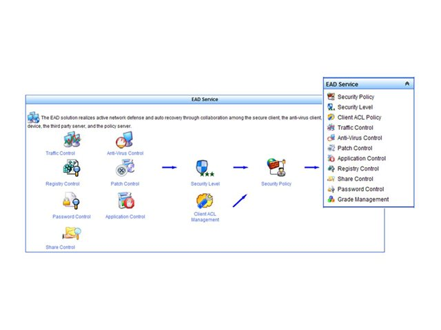 Le logiciel HPE IMC Endpoint Admission Defense (EAD) réduit l'exposition du réseau en intégrant une gestion des stratégies de sécurité et une évaluation de l'état des points de terminaison, afin d'identifier et d'isoler les risques dans le réseau. Le logiciel IMC EAD réduit le risque d'infections par code malveillant et d'autres failles de sécurité en détectant les violations, comme les virus, un trafic anormal ou l'exécution de logiciels sensibles. De plus, le logiciel peut également protéger les données sensibles grâce au contrôle des périphériques.